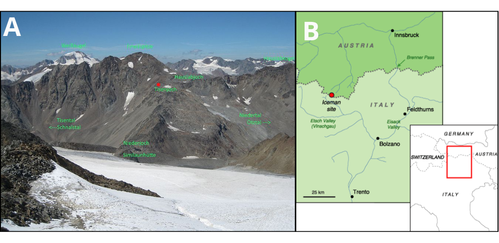 Este cuerpo momificado fue descubierto por dos alpinistas alemanes en los Alpes de Ötztal (fig. 2A), cerca de la frontera entre Austria e Italia (fig. 2B). Debido a que se había quedado cubierto por el glaciar, tanto el cuerpo como las pertenencias que llevaba consigo estaban excepcionalmente conservadas. De hecho, al principio pensaron que se trataba del cadáver de algún montañero perdido varios años atrás. Sin embargo, la prueba del carbono 14 reveló que Ötzi tenía unos 5300 años de antigüedad (Kutschera & Rom, 2000).