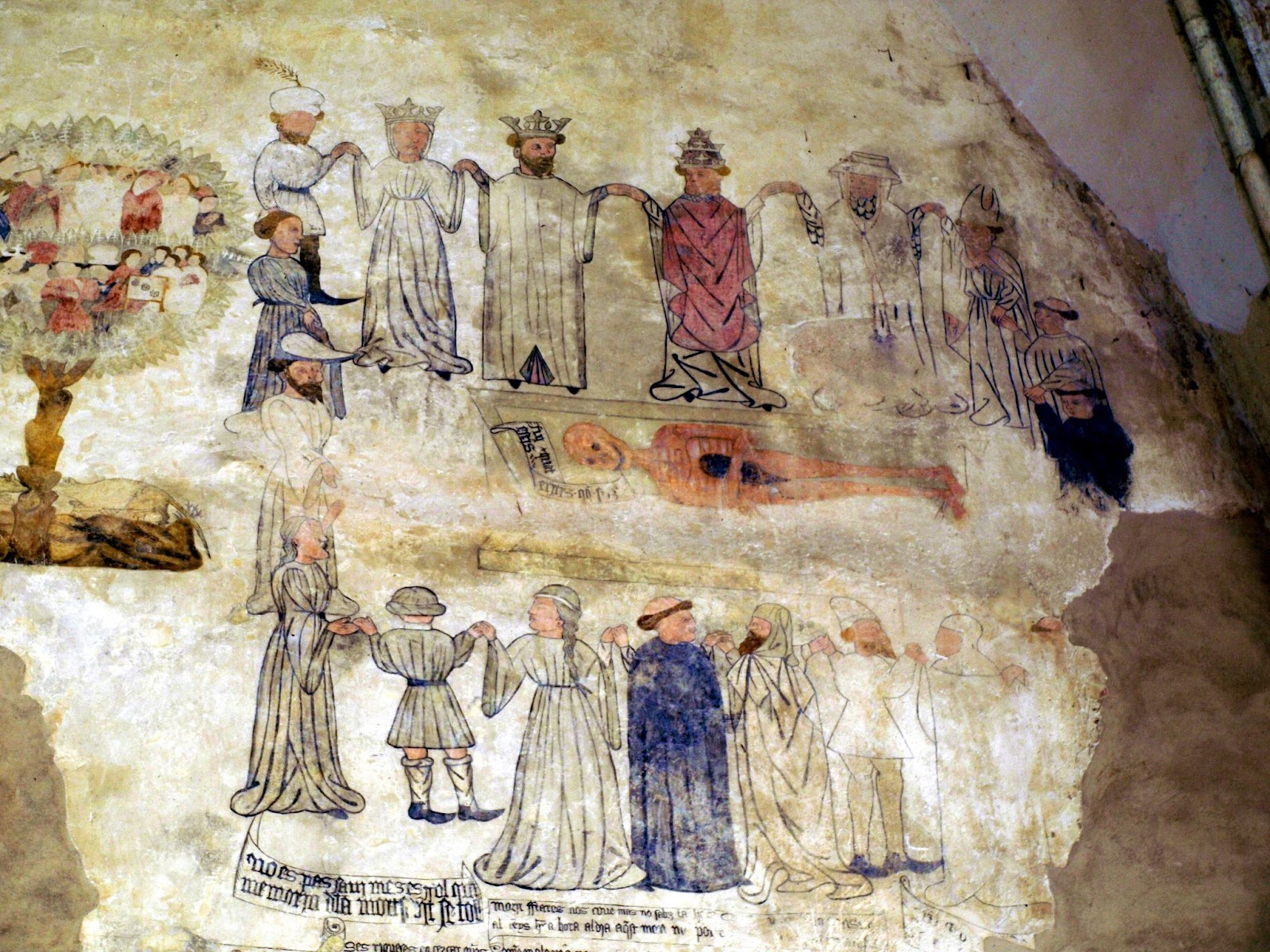 La iconografía de la muerte se extendió por otras partes de Europa, siendo un claro ejemplo de este fenómeno la representación de la danza macabra de la Iglesia de Hrastovlje donde de nuevo aparecen toda una amalgama de personajes procedentes del mundo terrenal y de ultratumba, encabezando a modo de séquito una encarnación de la viveza. La muerte es entendida como la igualadora social, y estableciendo un sentido banal del poder y la riqueza. (González Zymla, 2014).