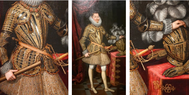 Con respecto a la indumentaria del torso es importante mencionar que durante el siglo XVII las dos prendas imprescindibles en el guardarropa masculino eran el jubón y las calzas. La primera de estas prendas se colocaba sobre la camisa, siendo esta una prenda de interior. Teniendo en cuenta el retrato del que estamos hablando deducimos que bajo la armadura se encuentra dicha prenda, ya que su función era sostener las calzas atacadas tal y como se representa en la obra. De este modo las dos piezas más importantes del traje masculino quedaban unidas constituyendo una única pieza. Por otra parte, debemos entender este retrato como una representación militar debido a que el rey porta encima del jubón una armadura la cuál se inspira en el grupo de guarniciones milanesas pertenecientes al rey.