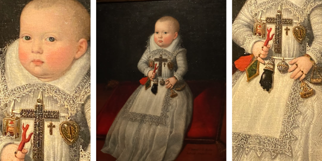 De este retrato podemos destacar la cruz latina de oro y diamantes que se encuentra en el pecho de la pequeña, además, del coral que porta en su mano derecha considerado como la mejor protección ante las enfermedades.