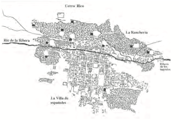 El desarrollo urbanístico está muy ligado a la evolución de la actividad minera. Es por ello, por lo que se puede distinguir dos fases en la consolidación y establecimiento del entramado urbano. La primera etapa se desarrolló́ durante los primeros años tras el redescubrimiento del Cerro Rico (1545-1570), tiempo en el que la cadena operativa minera residía en las manos de los indígenas con la tecnología de las wayras. Por un lado, los indígenas se fueron agrupando en la ladera del Cerro Rico, zona denominada La Ranchería. Las casas de los indígenas eran redondas, las llamadas Chipayas (Figura 4). En cambio, los españoles se ubicaron en el valle (la llamada Villa de los Españoles) y, a pesar de contar con un entramado desordenado, poseía cierta organización (Leggett, 2006: 40-41).