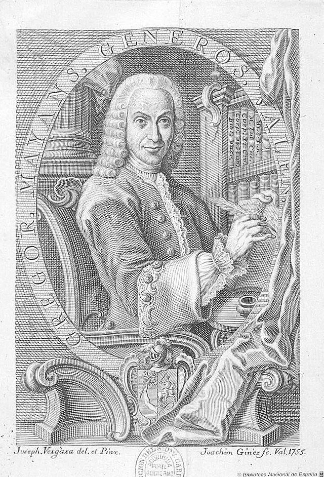 La primera de ellas es el valenciano Gregorio Mayans (1699-1781). A Mayans debemos sobre todo grandes aportaciones al estudio de la historia de la lengua castellana, siendo además un gran estudioso de Cervantes. Destacan entre sus obras su origen de la lengua española (1737), y su Vida de Miguel de Cervantes (1737).
