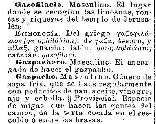 El siguiente diccionario consultado ha sido el de María Moliner (en su Diccionario de uso del español de 1973) quien lo define como: «sopa fría o ensalada, hecha de trocitos de pan, cebolla, tomate, etc., sazonada con ajo, sal, aceite y viagre, todo ello en crudo». Esta definición se asemeja enormemente a la actual de la RAE, salvo por el hecho de que ya no refiere al pimiento, que ha salido de la receta, o que, si lo leemos en un sentido cronológico, sería añadido con posterioridad. Pero si retrocedemos un poco más y acudimos al Diccionario general etimológico de la lengua española de Roque Barcia de 1880 podremos encontrar las siguientes definiciones en su tomo III: