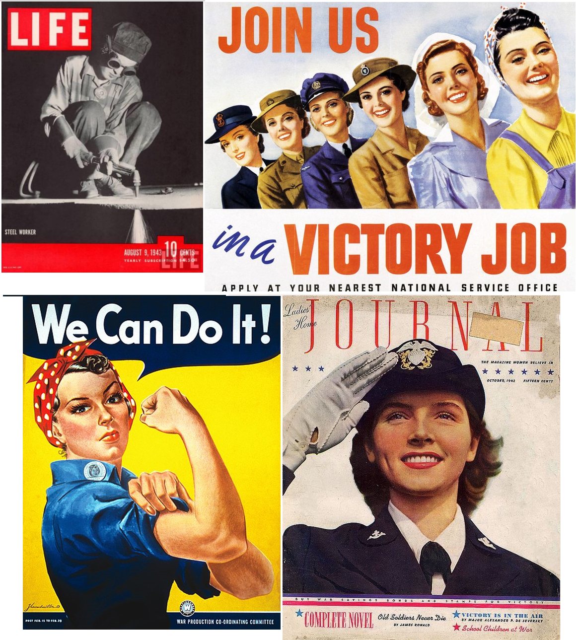 La propaganda laboral femenina fue abrumadora. No sólo en las fábricas; las mujeres eran reclamadas como enfermeras, guerrilleras, aviadoras, azafatas, etc. Los medios de comunicación pasaron de presentarlas charlando, tejiendo y felices en sus nuevos hogares, a mostrarlas trabajando, ayudando de manera decisiva a la victoria en el conflicto uniéndose al ejército o trabajando en fábricas y campos de cultivo –surgió entonces, por ejemplo, la famosa Rosie, la remachadora–.