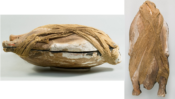 Estas cajas de comida solían tener carne de res o aves (patos, gansos, palomas…) que fueron preparadas para su conservación siendo momificadas, vendadas y depositadas en cajas individuales. Durante el Reino Nuevo eran de madera, cubiertas con yeso por fuera y con resina por dentro, tomando la forma del corte o del ave. Aunque para la XIX dinastía, Henutmehyt (BM EA51812), cantante de Amón a principios de dicha dinastía, tenía una caja de alimentos que era rectangular pintada de negro con una tapa plana, la cual contenía cuatro patos momificados envueltos en lino (fuente).