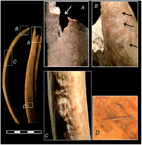 En la unidad estratigráfica 3 (UE 3), correspondiente al periodo mesolítico, se han documentado al menos dos individuos, en cuyos restos se ha podido observar marcas de desarticulación, incisiones, raspados y percusión. Sin embargo, la prueba más interesante, y que demuestra sin lugar a duda el consumo caníbal, son las marcas de mordeduras por parte de humanos, localizadas en dos costillas (Aura Tortosa et al., 2010: 172).