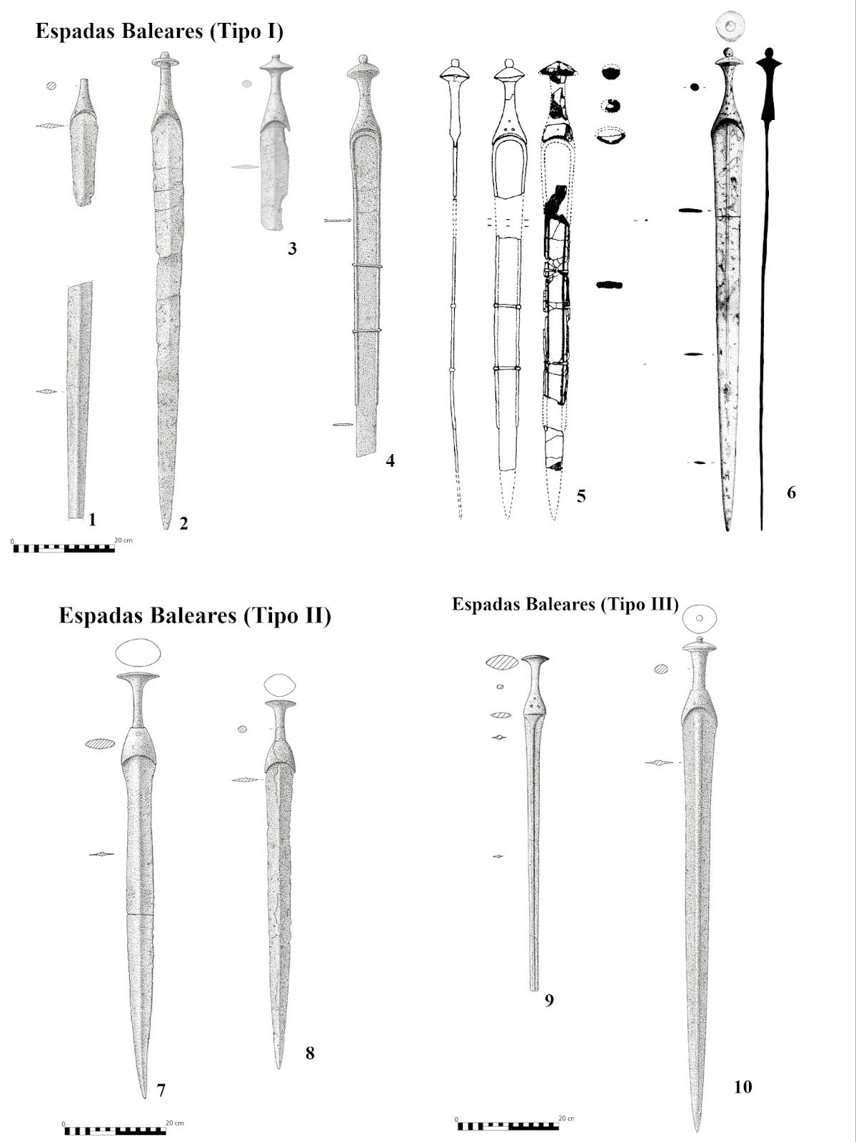 Todas las espadas de esta tipología parten del mismo principio (puño macizo unido a hoja con remaches) y son únicas en las Gimnesias y por eso las podemos clasificar conjuntamente. Hay que decir que, a pesar de que presenten esa misma línea común, cada uno de los objetos se diversifican y varían según el lugar donde se encuentran. El problema más grande es que la mayoría carece de información cronológica fidedigna, debido a su descubrimiento en el siglo pasado, y, además, se le añade, que probablemente se utilicen durante varias generaciones, por eso, a la hora de hablar de estos elementos, es muy complejo entender si llegaron a tener un orden temporal o simplemente todas partían de un mismo principio y cada metalurgo generaba unas características especiales.