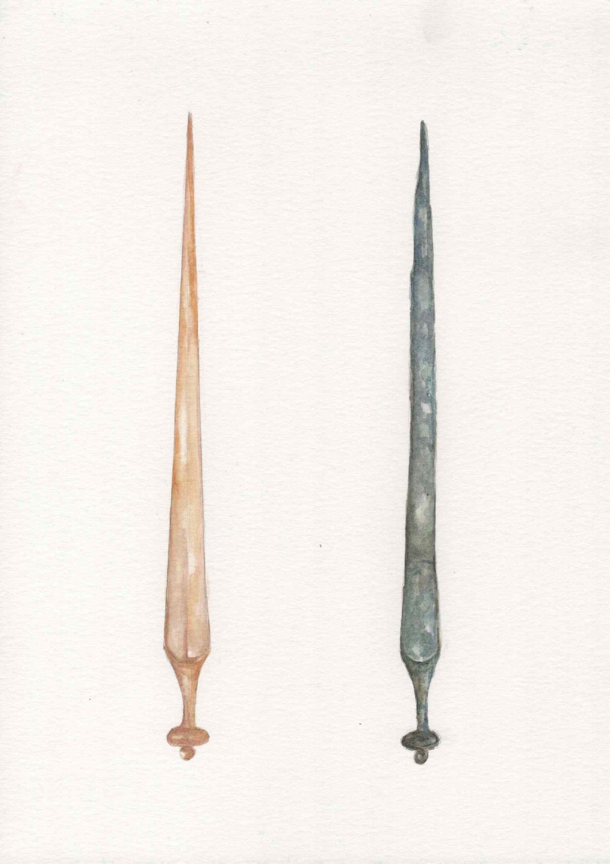 - Tipo II (nervio central nítido y hoja esbelta) (Fig. 2): Espada de Son Foradat (7) y la espada de Son Oms (8) tienen características más cercanas a modelos centroeuropeos como la espada de Rixheim.