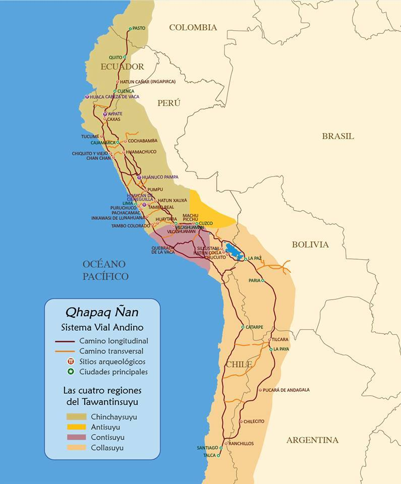 El Qhapaq Ñan es un sistema de caminos que atraviesa la cordillera de los Andes por seis países sudamericanos. Fue levantado por los incas sobre una red de vías preincaicas, con los wari y los chimú durante el Horizonte Medio. En el marco de los siglos XV y XVI «denominado Periodo Tardío», los incas unificaron los distintos territorios conquistados y extendieron esta red viaria por todos los territorios del Imperio para integrarlos. Así, el Qhapaq Ñan se convirtió en una herramienta clave para su proyecto político, militar, ideológico y administrativo conocido como Tawantinsuyu —-Imperio Inca, las cuatro partes juntas—- (Gómez, 2012: 138).