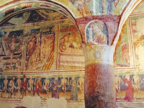 La iconografía de la muerte se extendió por otras partes de Europa, siendo un claro ejemplo de este fenómeno la representación de la danza macabra de la Iglesia de Hrastovlje donde de nuevo aparecen toda una amalgama de personajes procedentes del mundo terrenal y de ultratumba, encabezando a modo de séquito una encarnación de la viveza. La muerte es entendida como la igualadora social, y estableciendo un sentido banal del poder y la riqueza. (González Zymla, 2014).