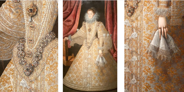 Una curiosidad sobre este retrato se encuentra en la figura de la reina ya que presenta una silueta triangular y plana donde resalta la suntuosidad de los tejidos que se entremezclan con las joyas destacando el «joyel rico». Esta majestuosa pieza está formada por un gran diamante acerado conocido como el «diamante del estanque» del que pende la «perla peregrina» (Ruiz Gómez, 2001, p. 17).