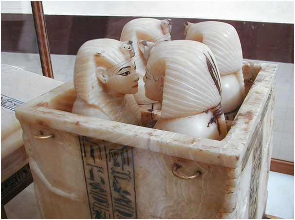 Dentro de este ritual funerario, destaca desde muy pronto la necesidad de extraer las vísceras del cuerpo y almacenarlas en recipientes que se depositaban en el interior de las tumbas. Se trataba de cuatro vasijas o urnas, conocidas como vasos canopos, donde se guardaban el hígado, los pulmones, el estómago y los intestinos. El corazón, por el contrario, debía mantenerse en el interior del cuerpo, ya que era la fuente de la razón, la memoria y los sentimientos de la persona (Garzón Rodríguez, 2016, p. 118).